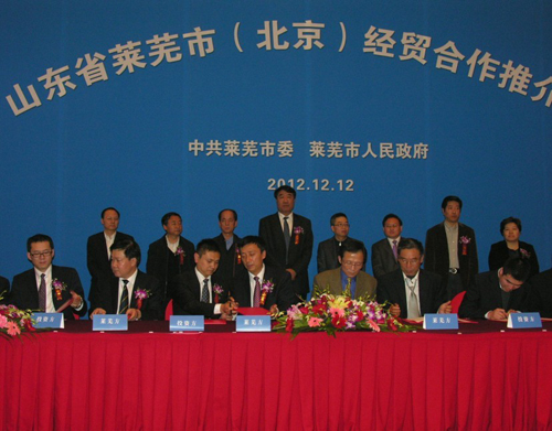2012年12月12日山东省莱芜市(北京)经贸合作推介会在北京香格里拉饭店召开。会议由莱芜市副市长丁习文主持,莱芜市市委书记刘士合、市长杨宜新等领导及知名投资企业的领导出席了此次会议,中景恒基集团作为投资方出席会议。